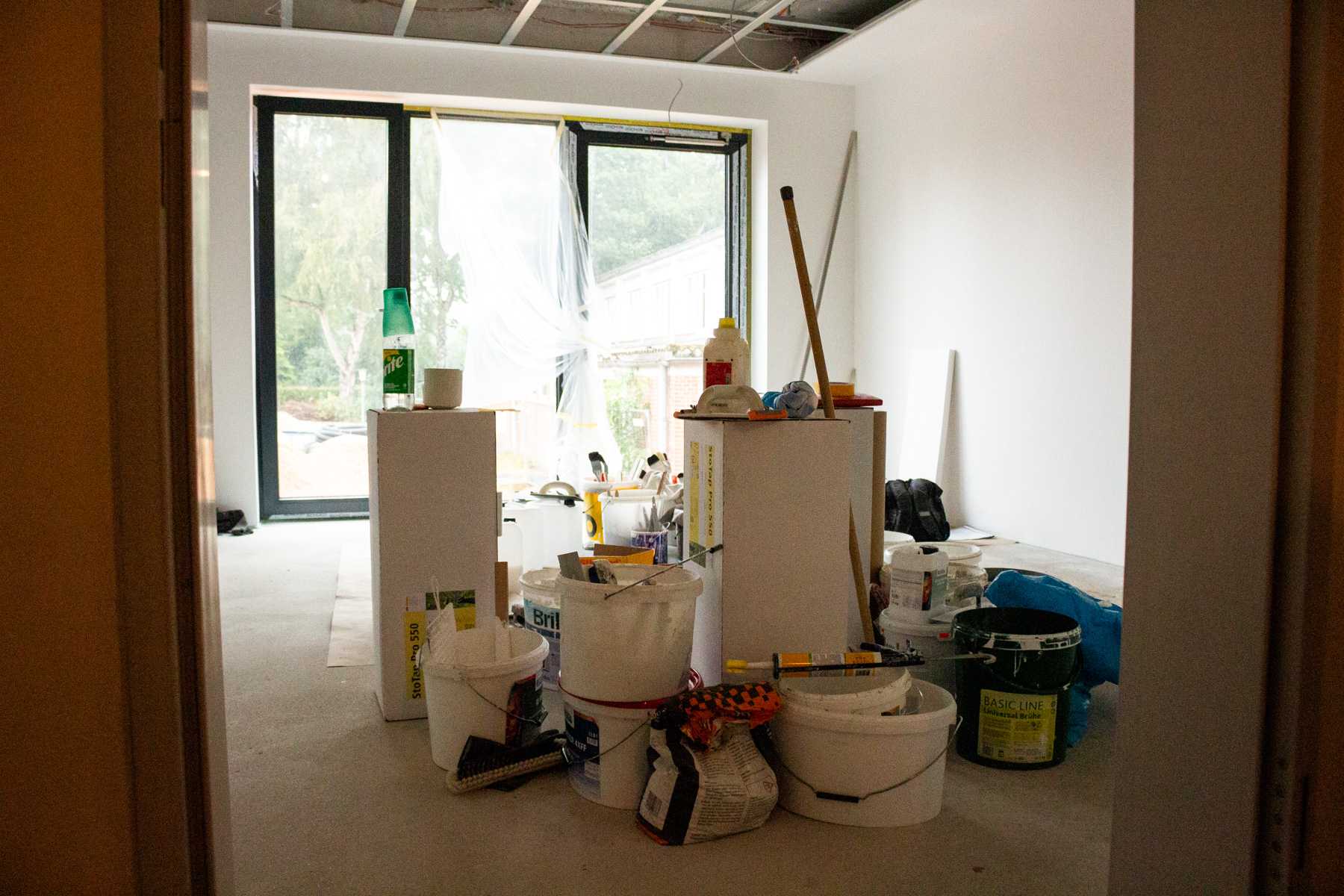 Momentan sind die Maler im Neubau und kümmern sich um die Wände. Die meisten Wände sind zwar noch nicht gestrichen, es ist aber schon ein Flies auf den Wänden. Wir finden, dass das schon ganz schön fertig aussieht. Dann kann es ja nur noch schöner werden, wenn die letzten Pinselstriche fertig sind.