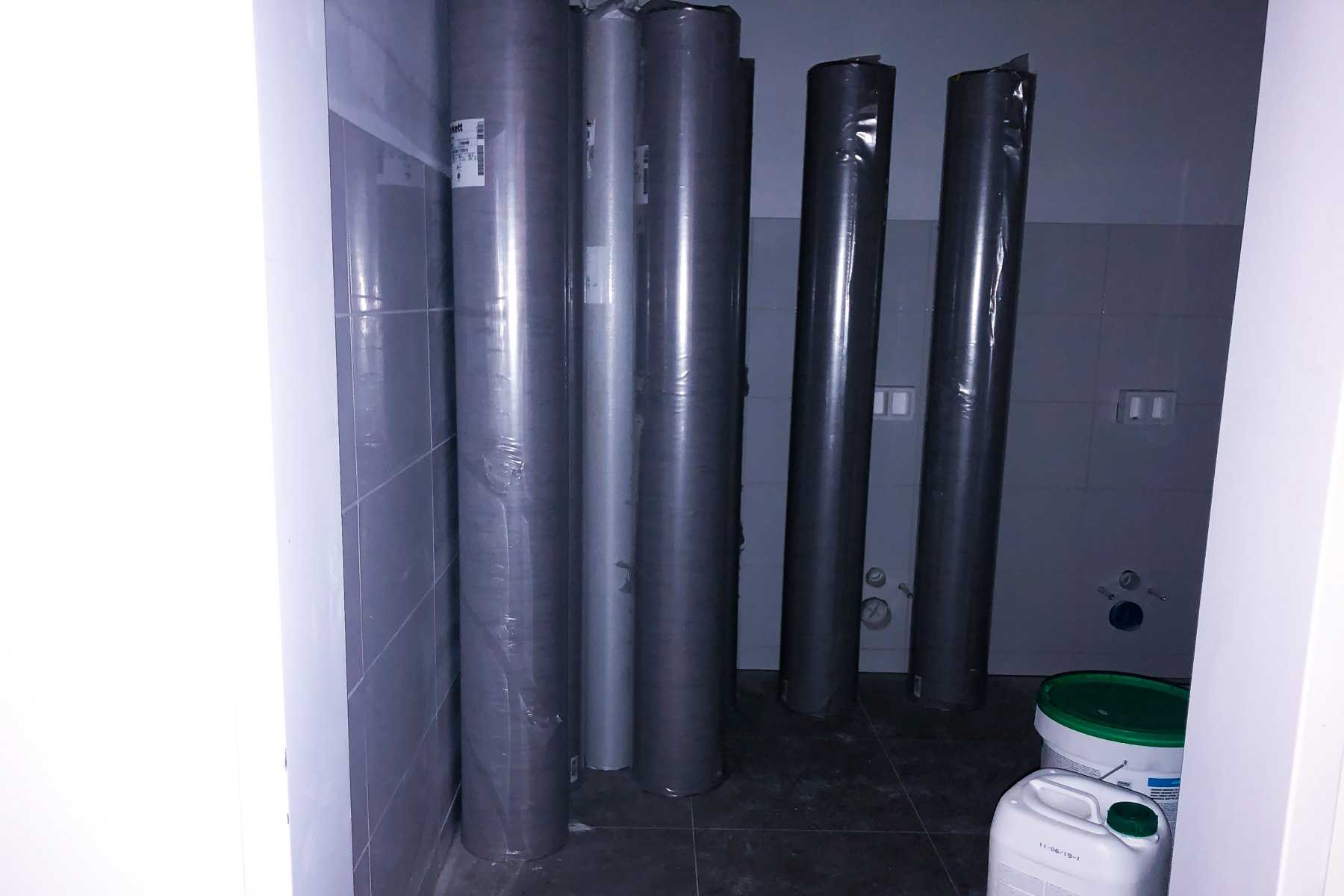 In den letzten Wochen drehte sich auf der Baustelle viel um den Boden. Drinnen wurde alles auf das Verlegen des Fußbodens vorbereitet und die großen Rollen mit dem Belag stehen auch schon bereit.