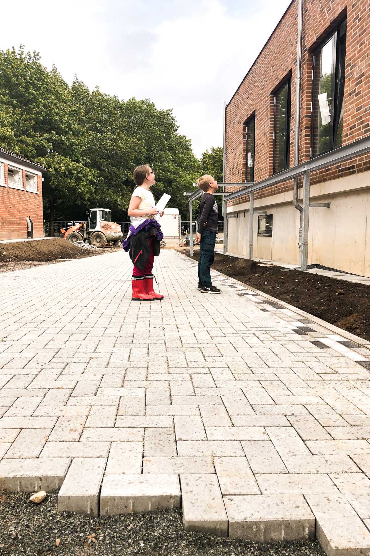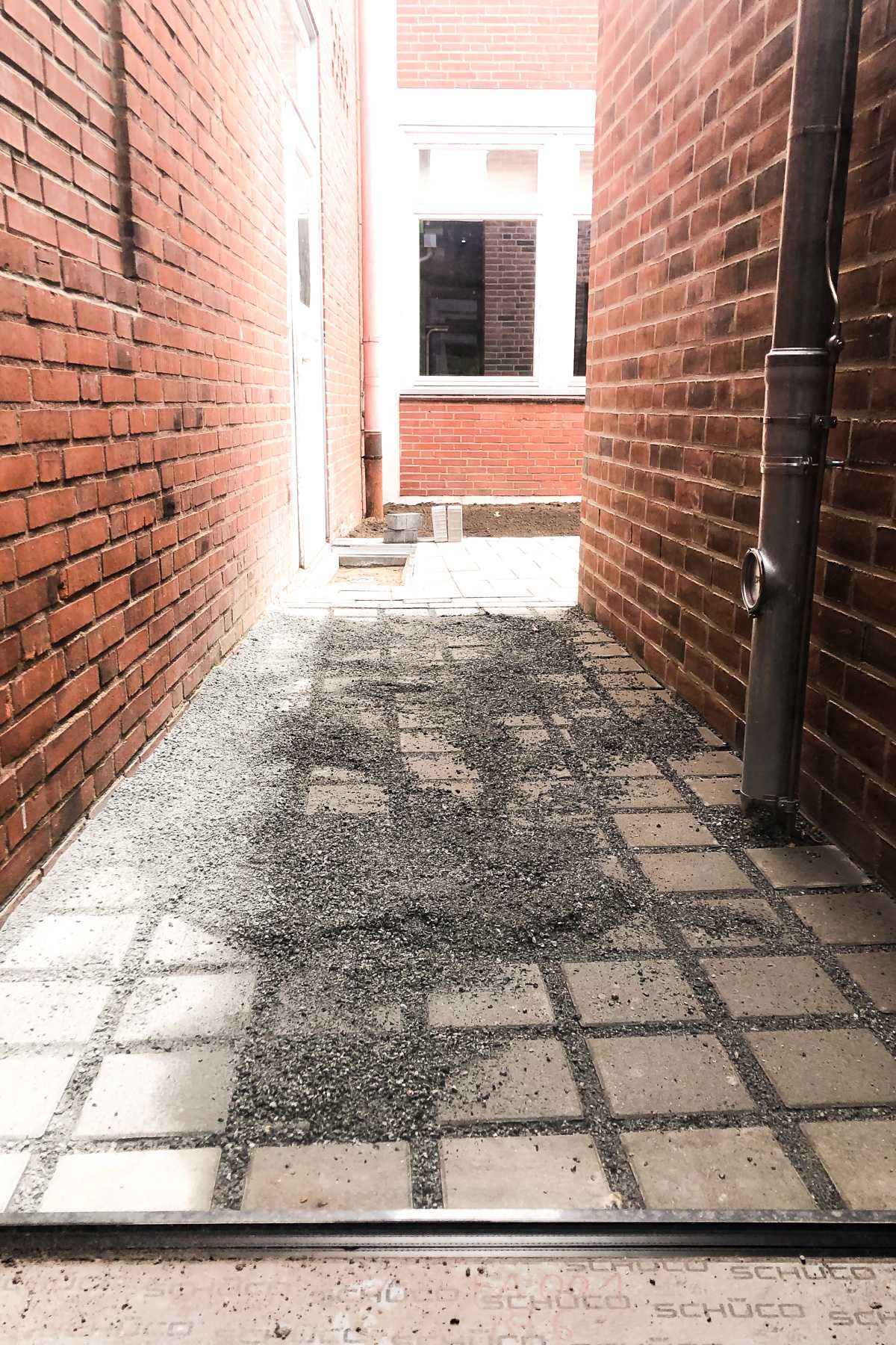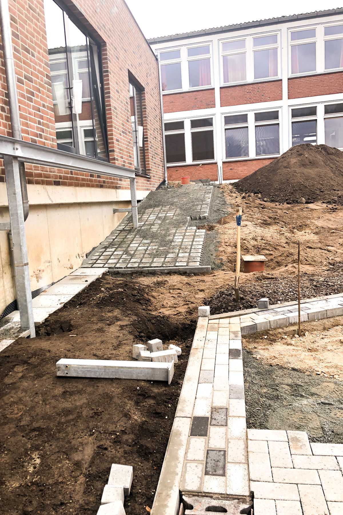 Auch draußen hat sich am Boden so einiges getan. Die neuen Pflastersteine wurden verlegt. Zwar liegt überall noch eine Menge Sand, man kann sich aber schon vorstellen hier bald normal herumlaufen zu können. Der neue Weg, der zum Schulhof führt, sieht fast aus wie ein Laufsteg. Außerdem wurde uns erklärt, dass an den Rändern des Weges Kiesrasen angelegt wird.