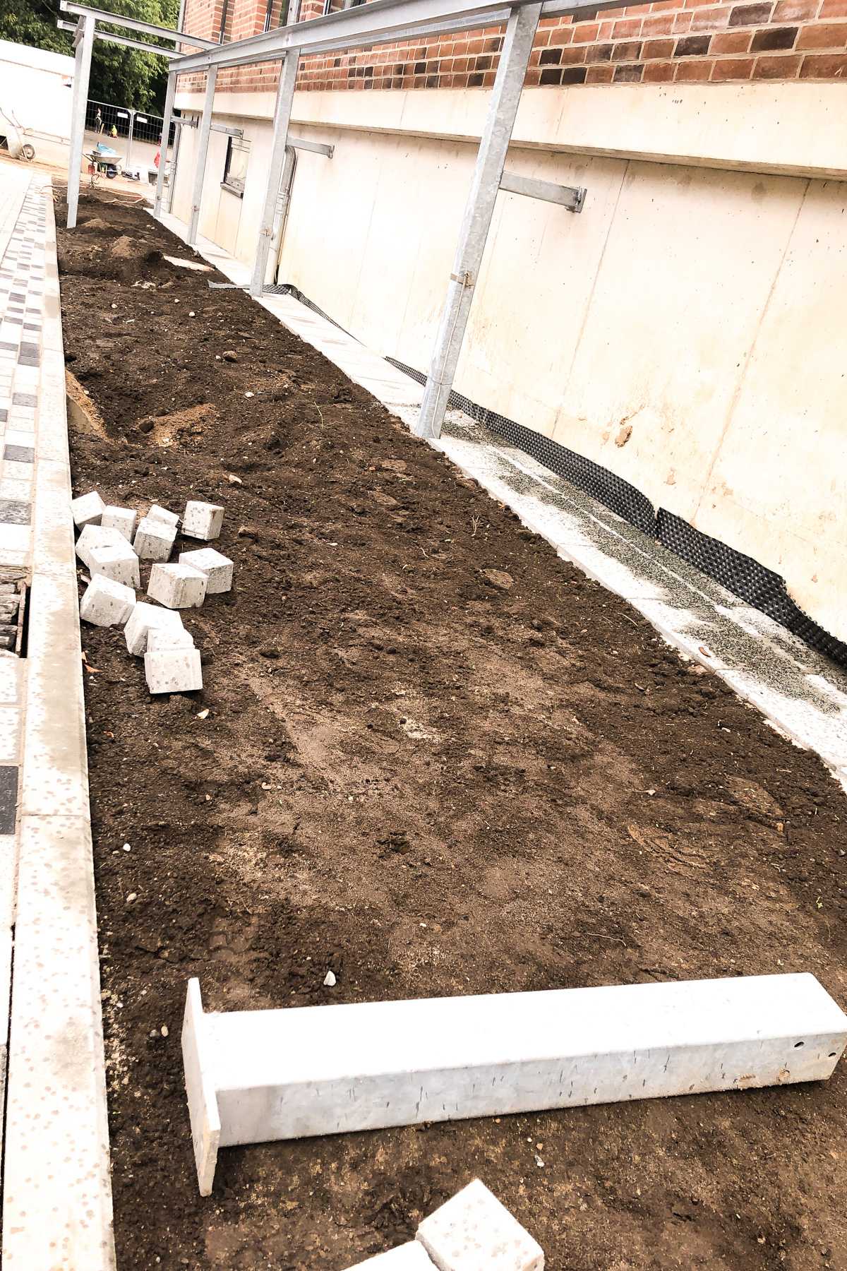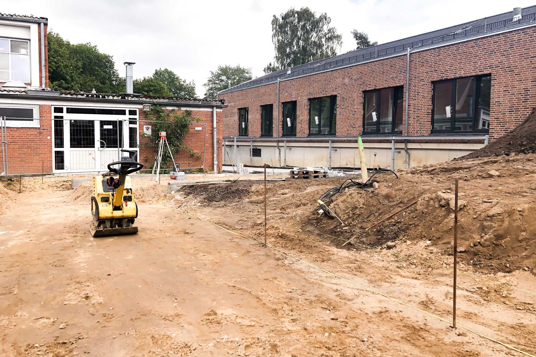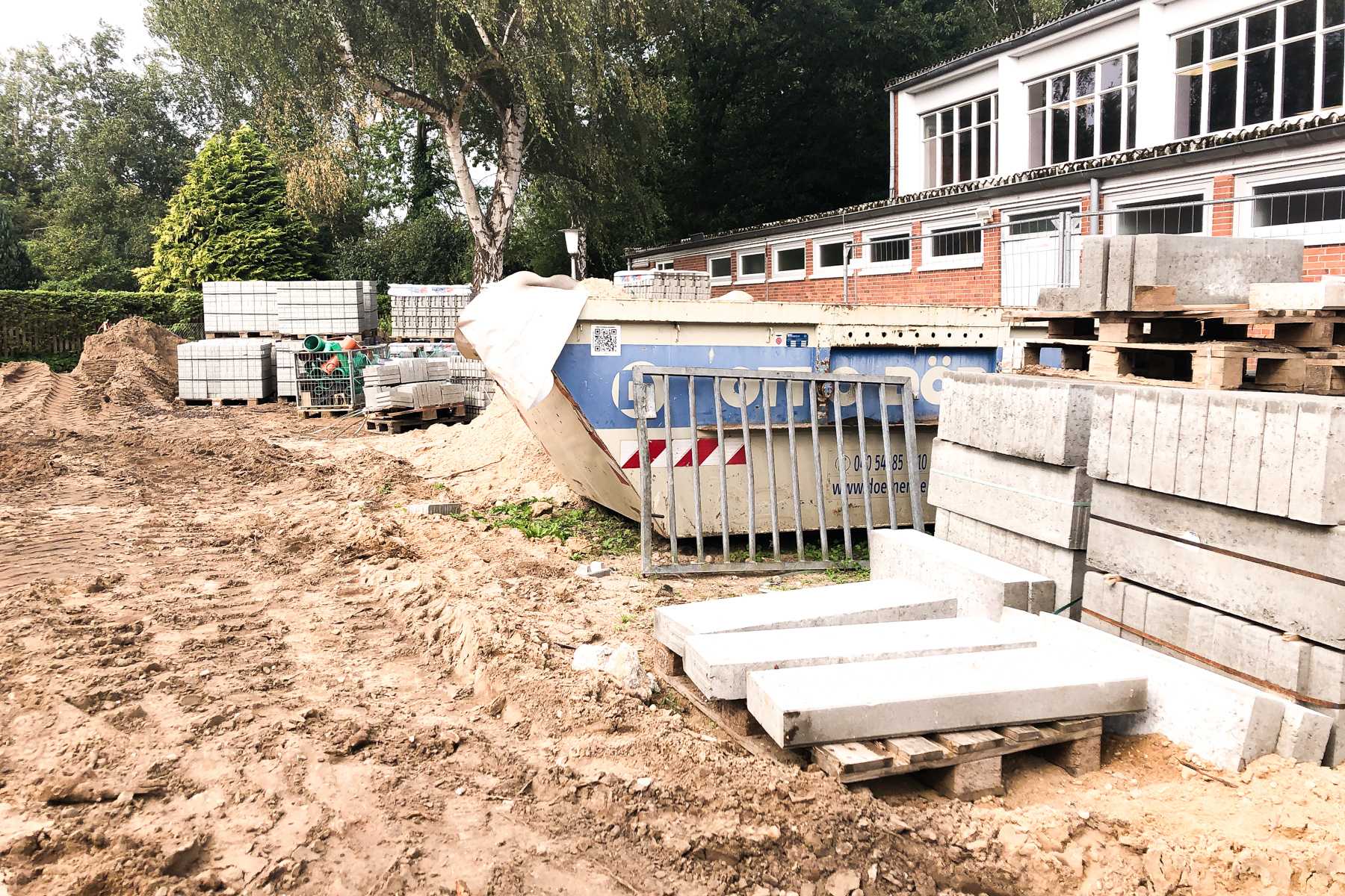 Auch draußen hat sich am Boden so einiges getan. Die neuen Pflastersteine wurden verlegt. Zwar liegt überall noch eine Menge Sand, man kann sich aber schon vorstellen hier bald normal herumlaufen zu können. Der neue Weg, der zum Schulhof führt, sieht fast aus wie ein Laufsteg. Außerdem wurde uns erklärt, dass an den Rändern des Weges Kiesrasen angelegt wird.
